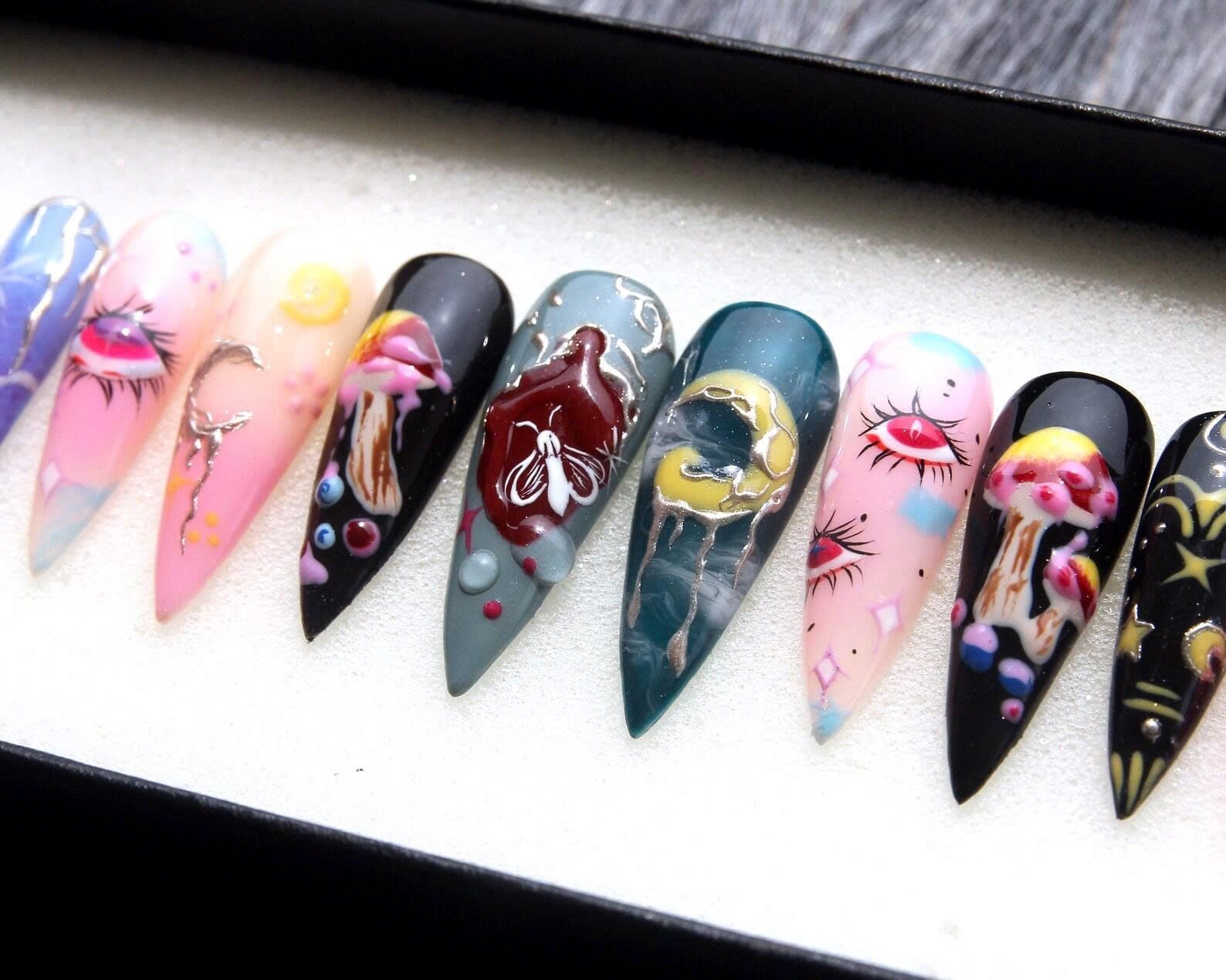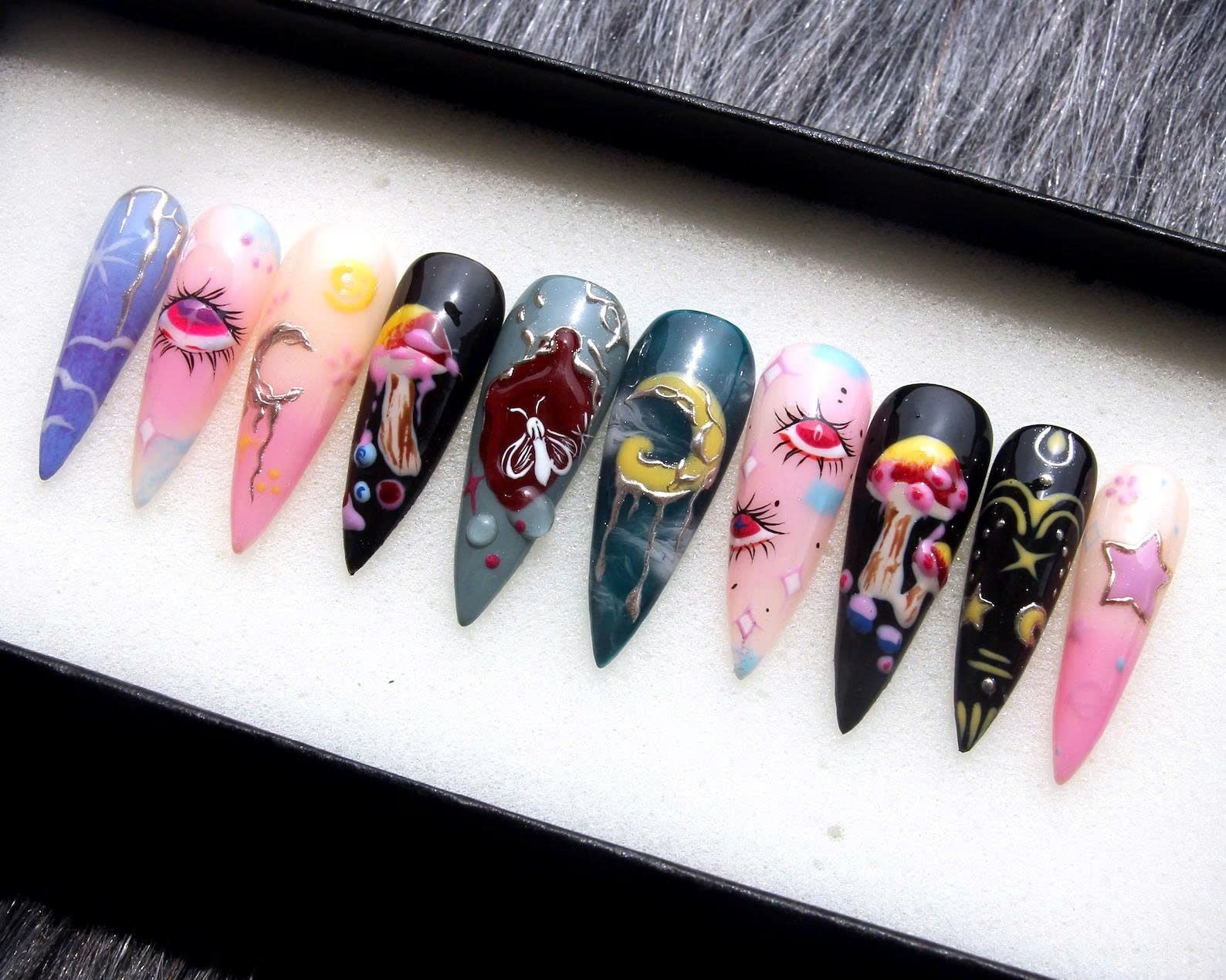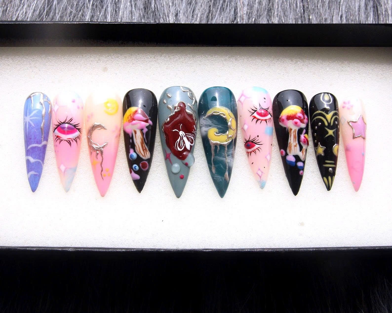 A dreamy mix of cosmic art - moon, stars, eyes, and jellyfish, blending fantasy with mystery for a bold, magical look