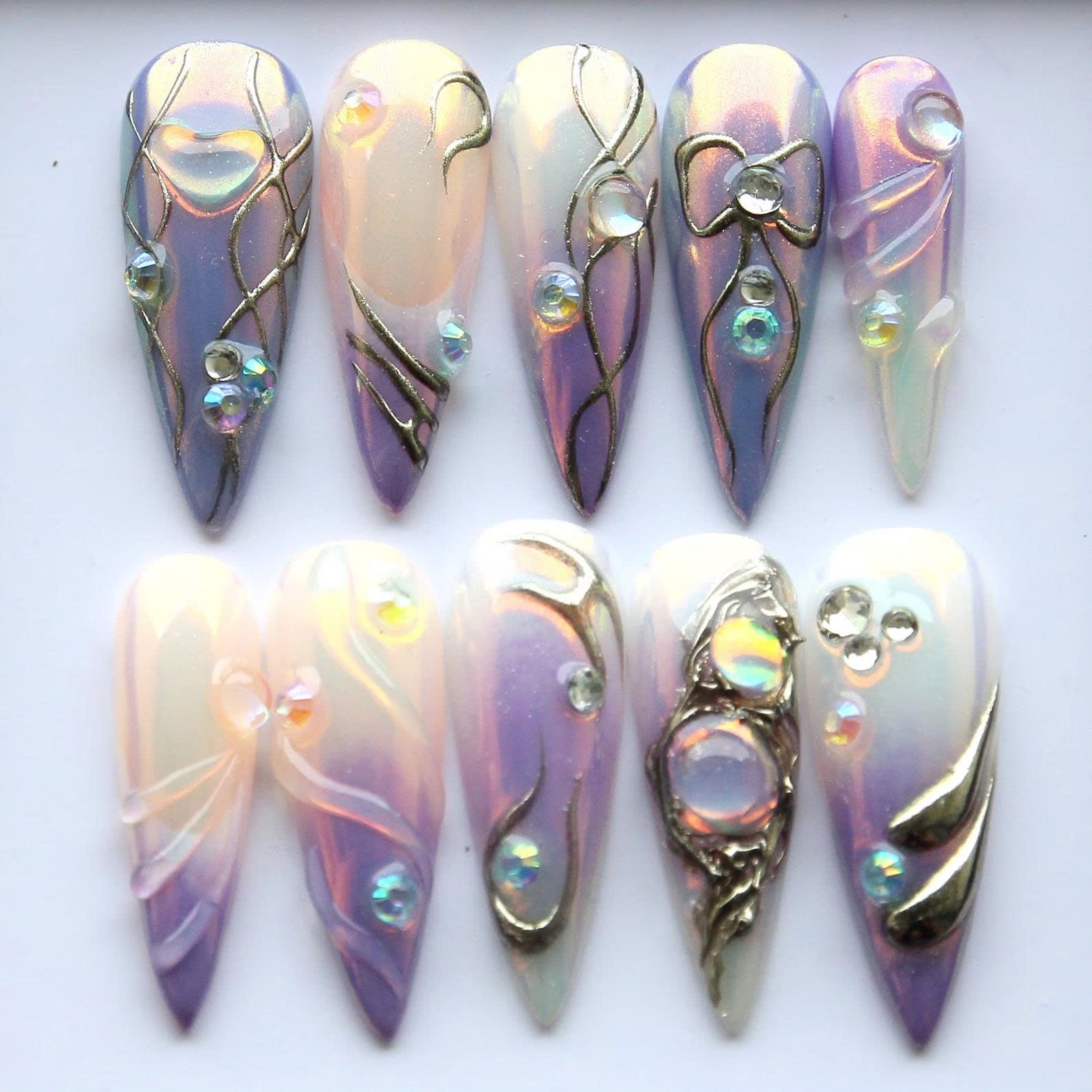 Galaxy Glow nails feature a dreamy mix of pearl shine and purple hues with sparkling gems
