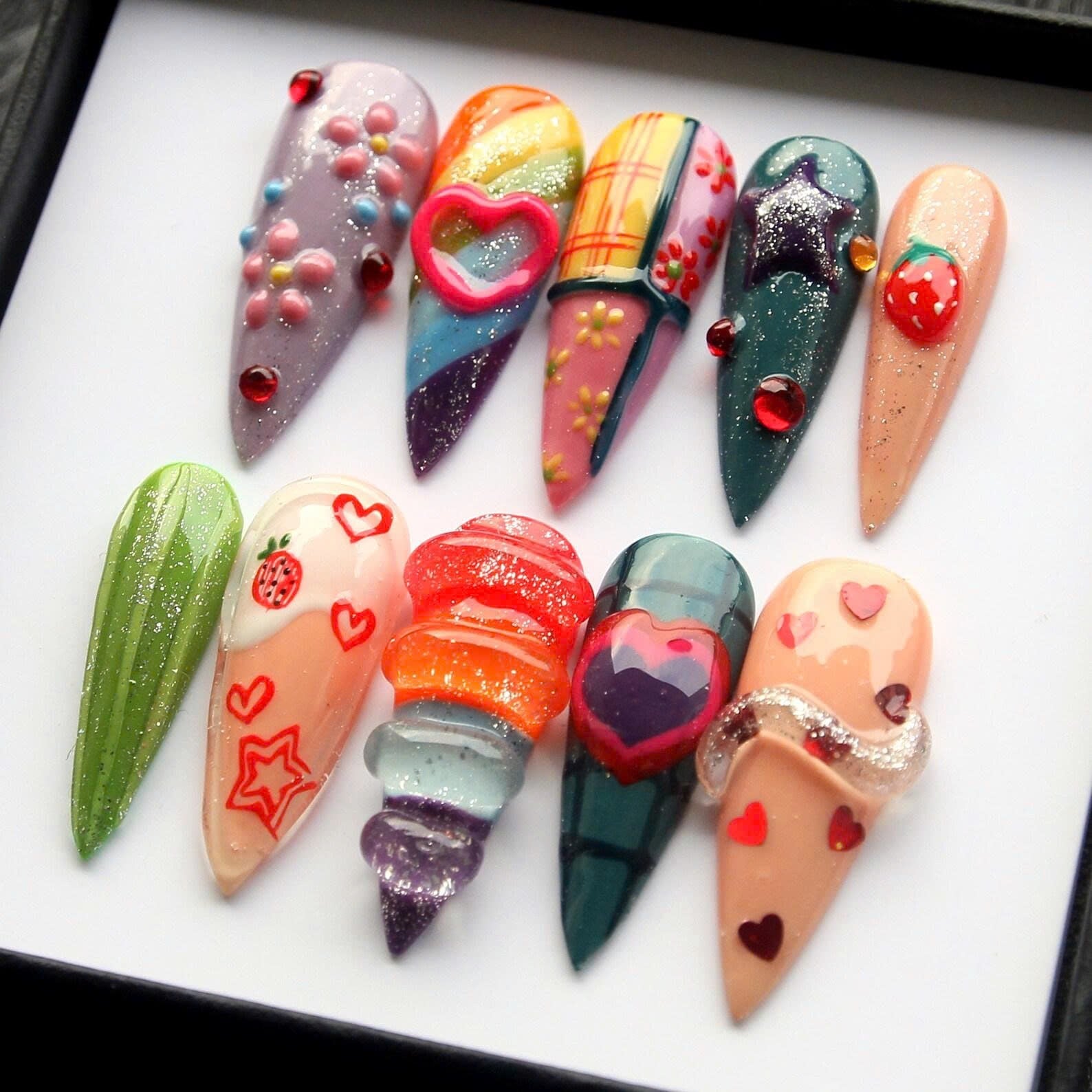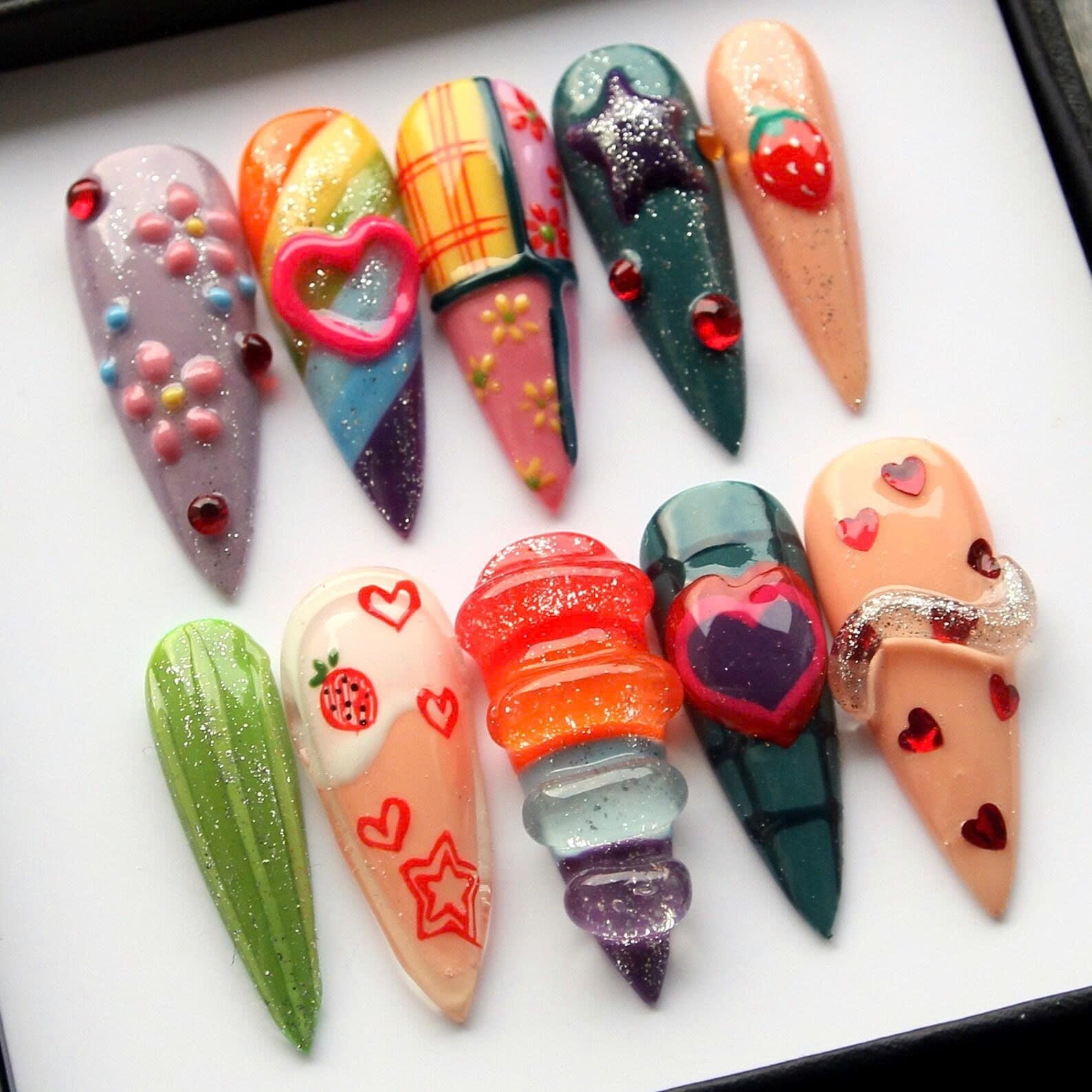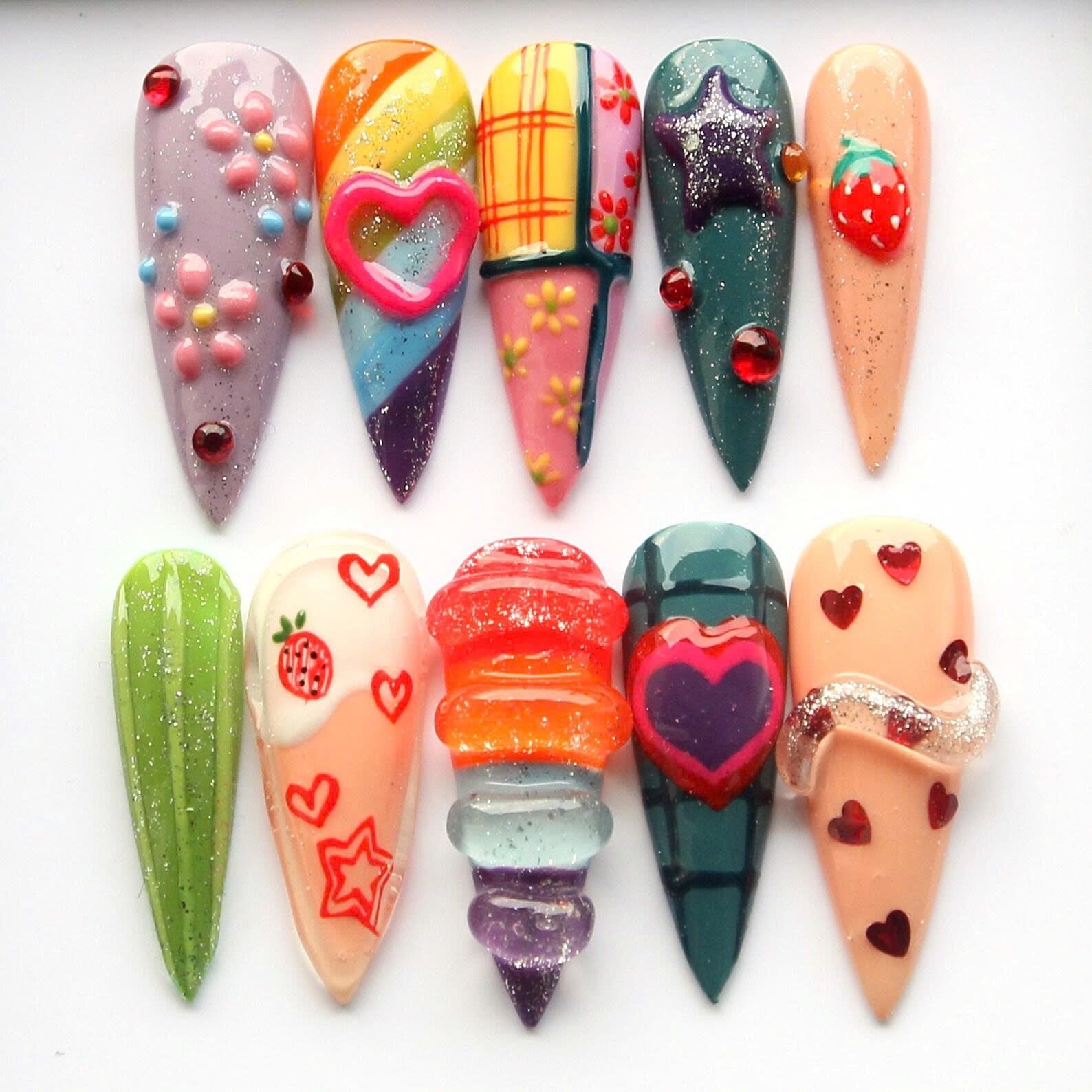 Colorful nails with sparkling 3D details and lovely heart designs - just like a love carnival