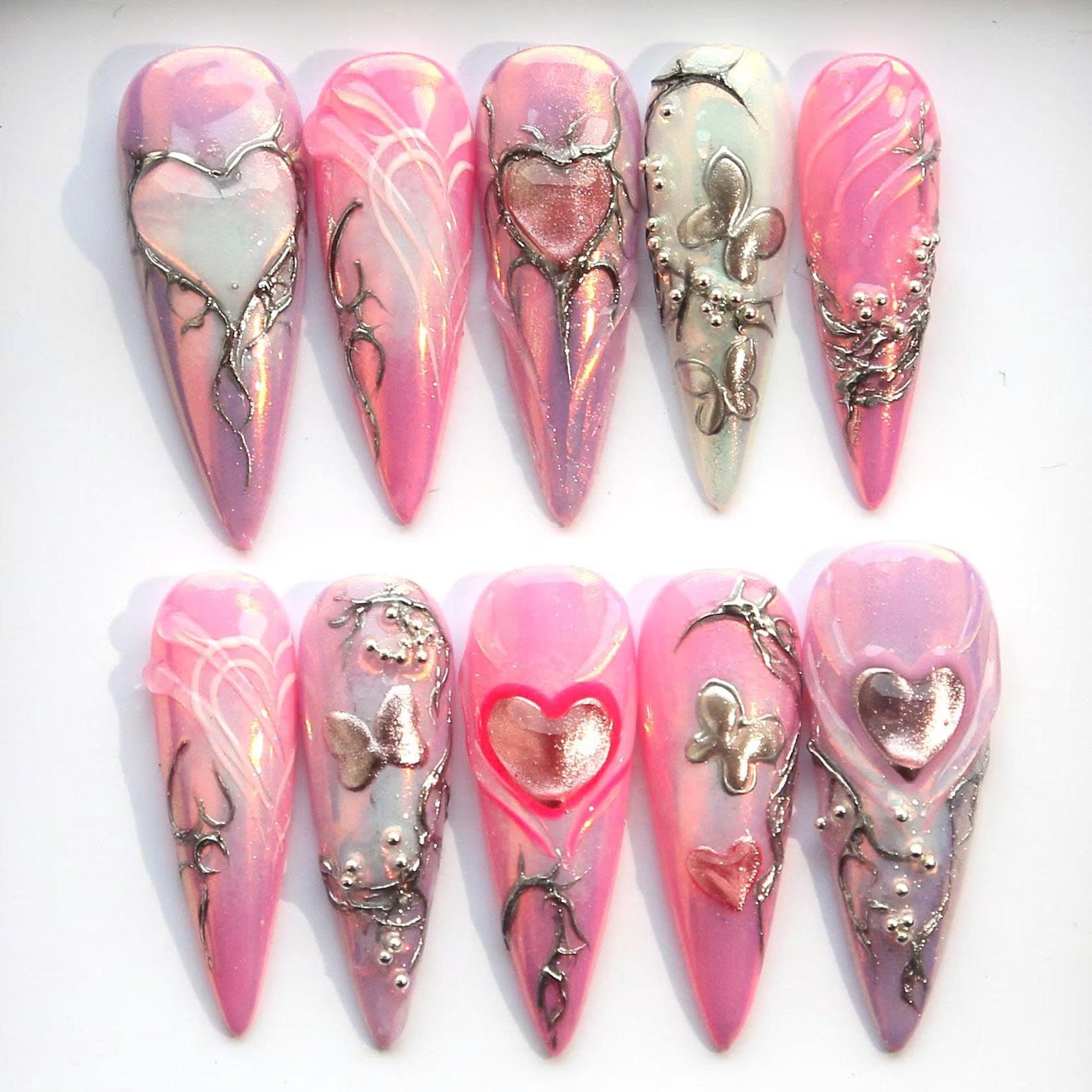 Romantic Edge nails blend soft pink tones with metalic accents and 3D heart designs