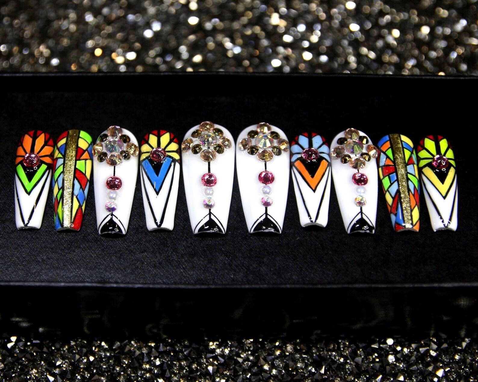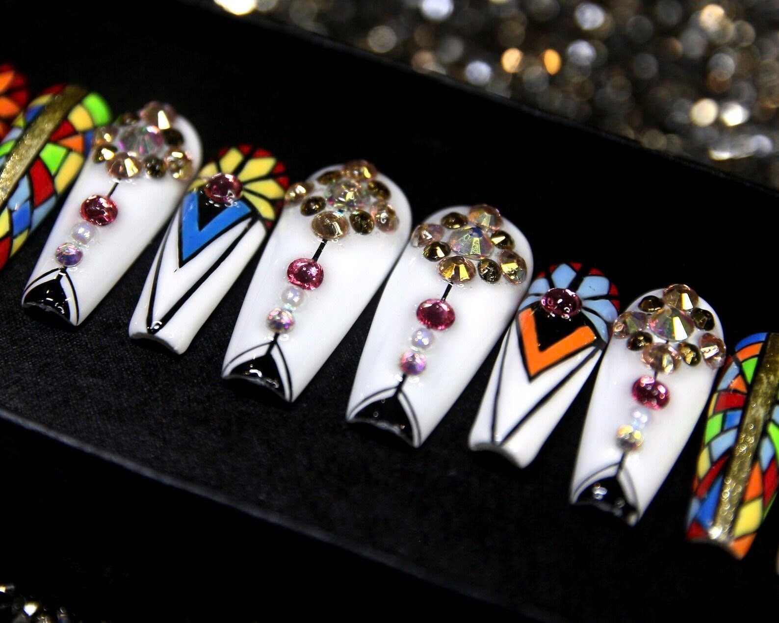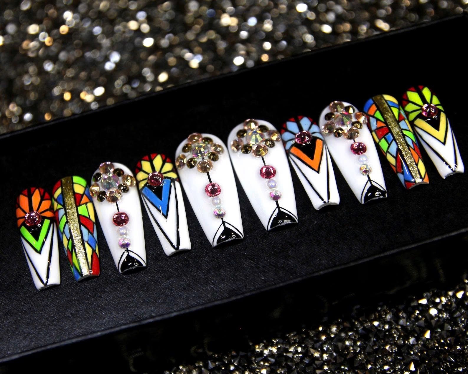 An artistic nail set inspired by colorful stained-glass windows, adorned with sparkling stones for a refined and unique look