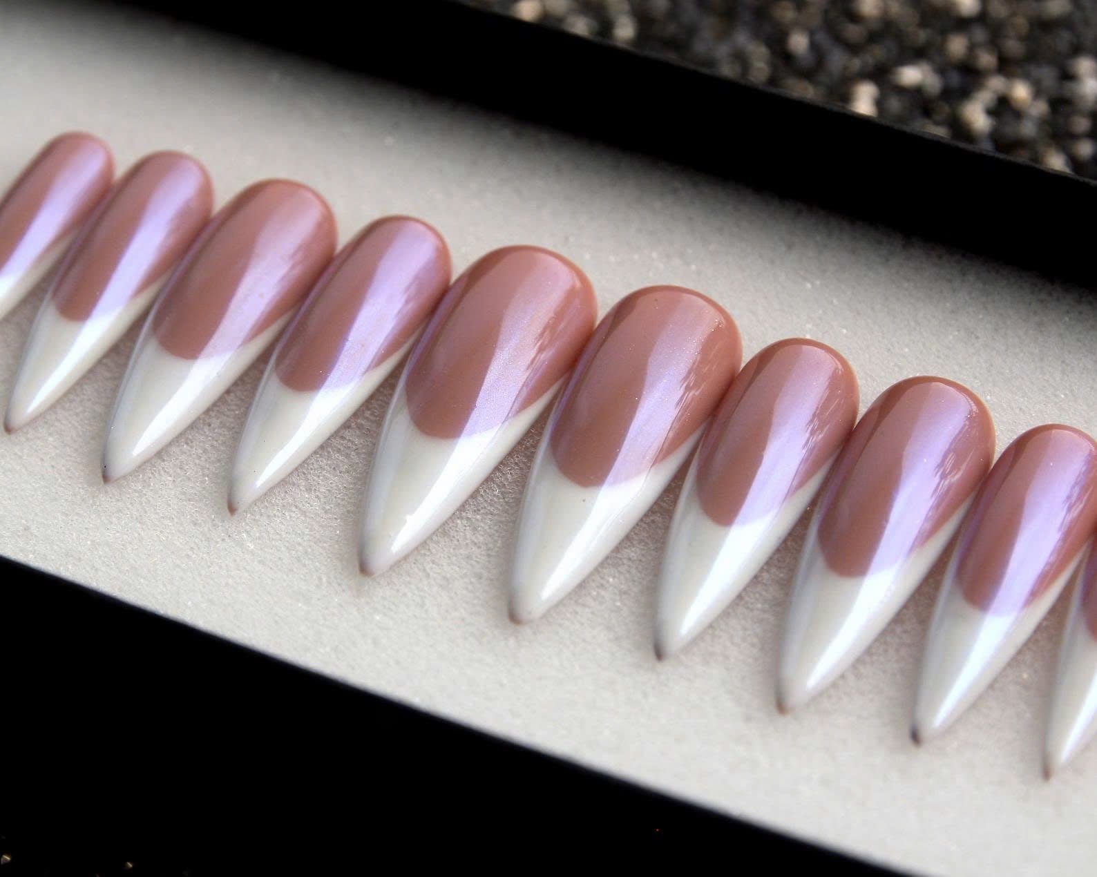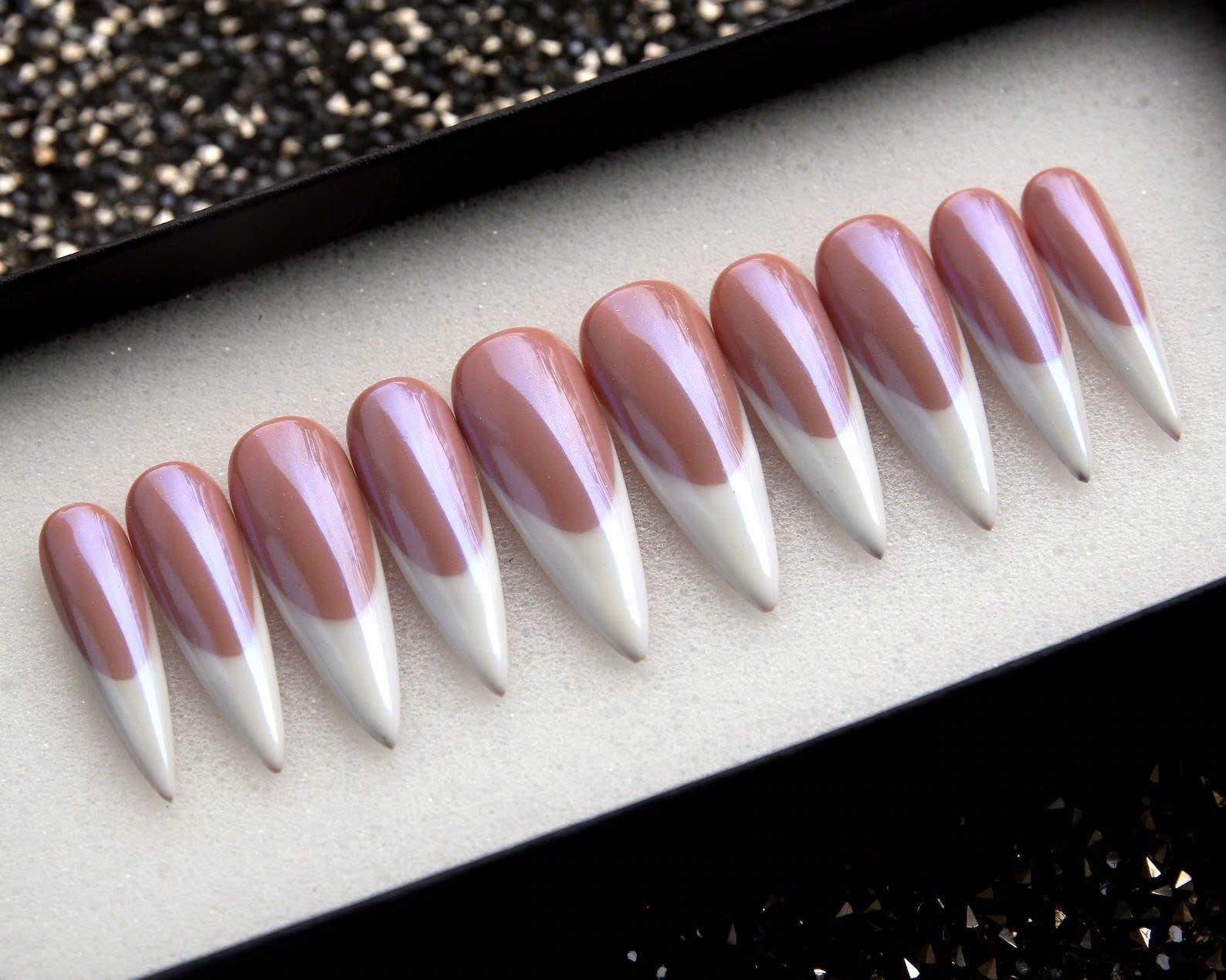 Elegant nails with shimmering pink-purple tones and sharp white tips - bold, stylish, and eye-catching.